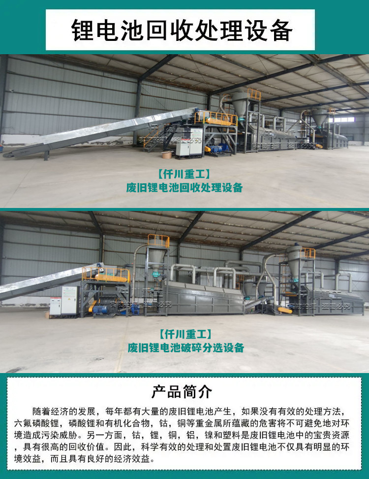 仟川重工鋰電池破碎回收設(shè)備目的是提供一種新型的廢舊鋰電池的回收處理方法,采用該方法能夠回收電池中的鈷,銅和鋰等貴重金屬元素,解決廢舊鋰電池的污染問題,實現(xiàn)資源的經(jīng)濟(jì)化回收利用。該鋰電池回收設(shè)備具有工藝簡單,經(jīng)濟(jì)實用的特點。