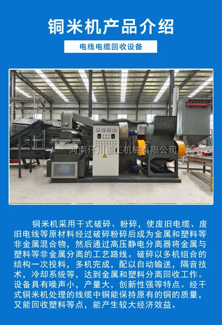 銅米機(jī)是一種新式的再生資源回收的設(shè)備,可緩解目前資源趨向匱乏的危機(jī)。銅米機(jī)設(shè)備是針對(duì)各種汽車(chē)電路線、摩托車(chē)線,電瓶車(chē)線以及電視機(jī)、洗衣機(jī)、電冰箱、空調(diào)等各種家用電器線,還有通訊線、電腦線等各種剝線機(jī)不適合加工的各種廢線、雜線。銅米機(jī)設(shè)備整體結(jié)構(gòu)緊湊,布局合理,占地面積小,操作簡(jiǎn)單方便,只需接上電就可以直接進(jìn)入生產(chǎn)。設(shè)備中安裝的有全自動(dòng)粉碎機(jī),上料,粉碎,吸塵,分離。全過(guò)程只需一人投料,即可完成生產(chǎn)處理,設(shè)備具有的集塵設(shè)備,干式分選后,分離出來(lái)的成品是可以直接進(jìn)入市場(chǎng)進(jìn)行銷(xiāo)售。